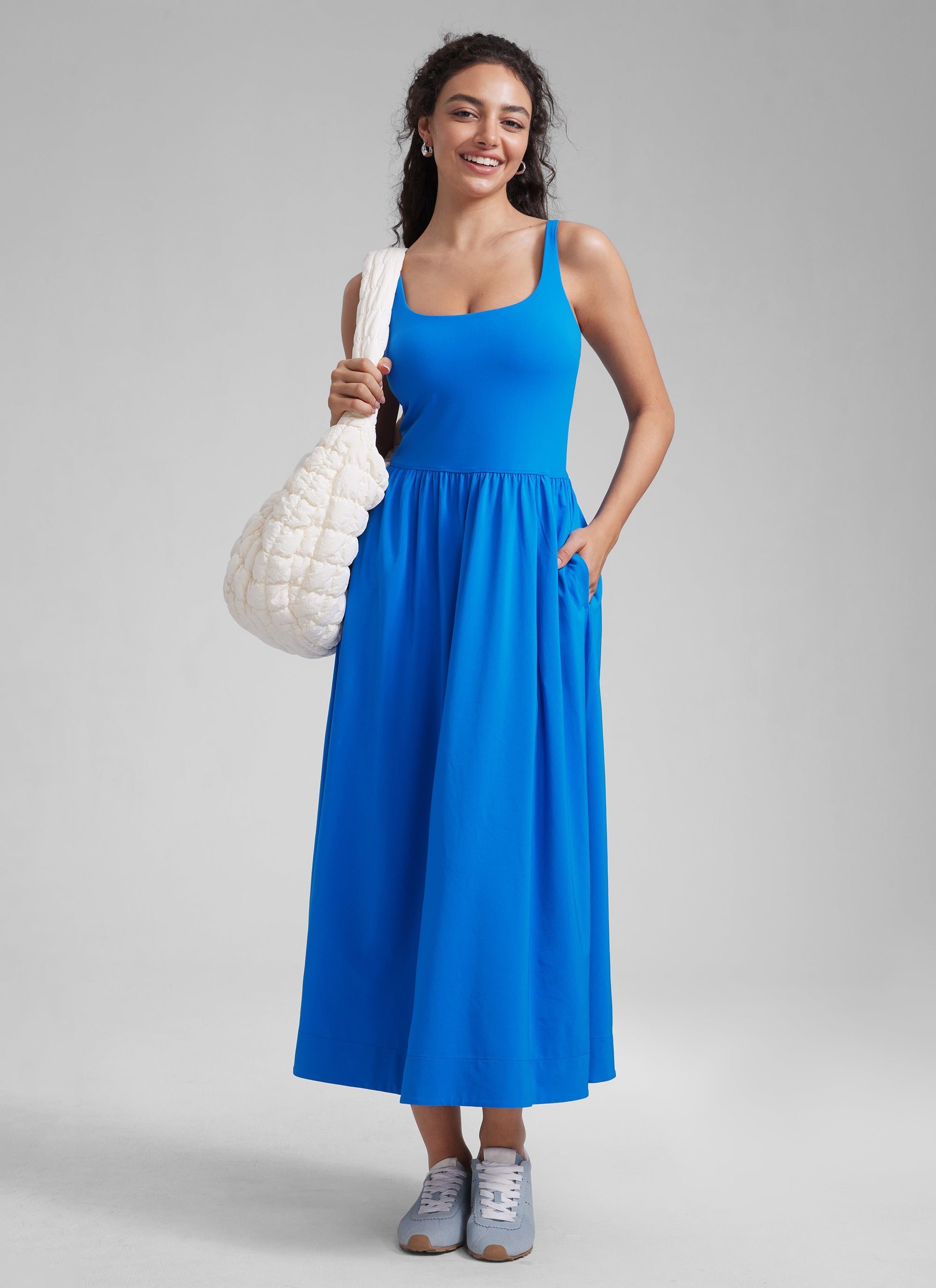 A square neck tank dress, features a butterluxe soft knit top and a feathery-fit flowy long skirt, perfect for an easy day-to-night option.