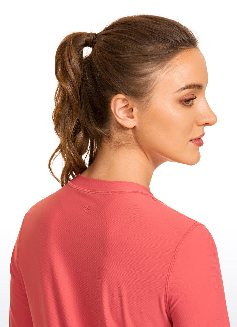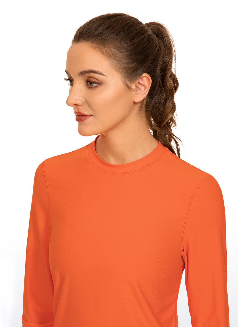 UPF 50+ long sleeve rash guard shirt, which fabric is smooth and waterproof, with good four-way stretch and breathability, and has a certified UPF50+, which can resist the sun's ultraviolet rays on the skin. High neck design for good coverage.